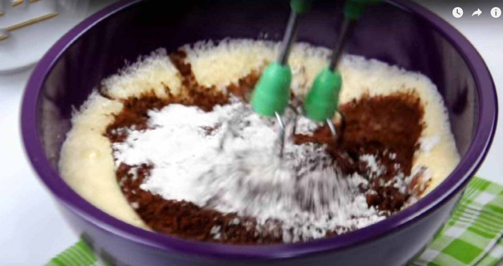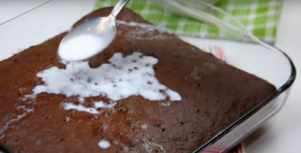 2 yemek kaşığı süt 1 yemek kaşığı sıvı yağ bir buçuk su bardağı un 1 paket kabartma tozu 1 çay bardağı kakao ilave edilerek güzelce çırpılır.