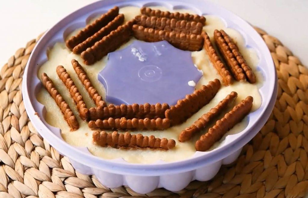 Muhallebimiz henüz sıcakken içerisine kakaolu bisküvi batıralım ben bu aşamada kakaolu Petibör Bisküvi kullandım Siz Dilerseniz farklı çeşit bisküvilerde kullanabilirsiniz