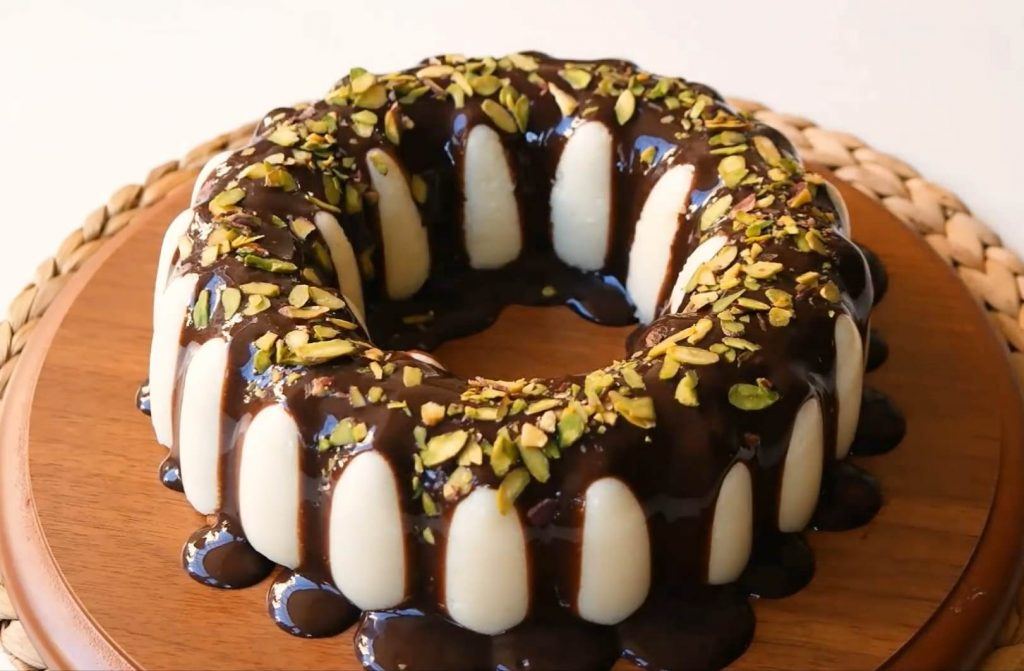 Bisküvili tatlımızın üzerine çikolata sos dökelim ve Antep fıstığı ile süsleyelim