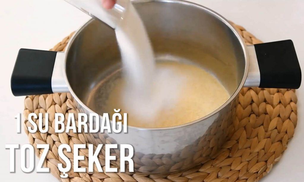 Öncelikle bir tencereye, 1 su bardağı irmik ve 1 su bardağı toz şekeri koyalım
