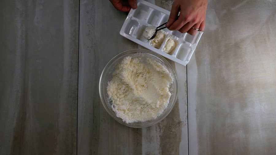 Büyük bir kaseye kabartma tozunu koyun ve ardından sitrik asidi veya limon suyunu ekleyin. Sonrasında bulaşık deterjanını da ekleyerek çırpıcı yardımıyla güzelce karıştırın ve ardından buz kalıplarına yerleştirin.