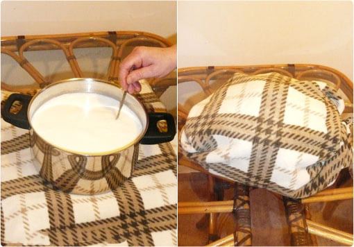 Bu işlemin ardından kapağını kapatıp fazla olmamak kaydıyla bir battaniyeye sarıyoruz ve 4 saat sonunda hazır olan yoğurdumuzu buzdolabına alıyoruz. Ertesi gün afiyetle tüketmeye hazır olacaktır.