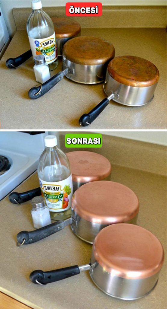 Bakır kaplar yemek pişirmek için mevcut en iyi tür olarak kabul edilir. Tekrar yepyeni görünmelerine yardımcı olmak için tuz ve sirke kullanın. Bakır kabınızın yüzeyine tuz serpin, sonra üzerine biraz sirke dökün ve sert bir süngerle ovalayın.