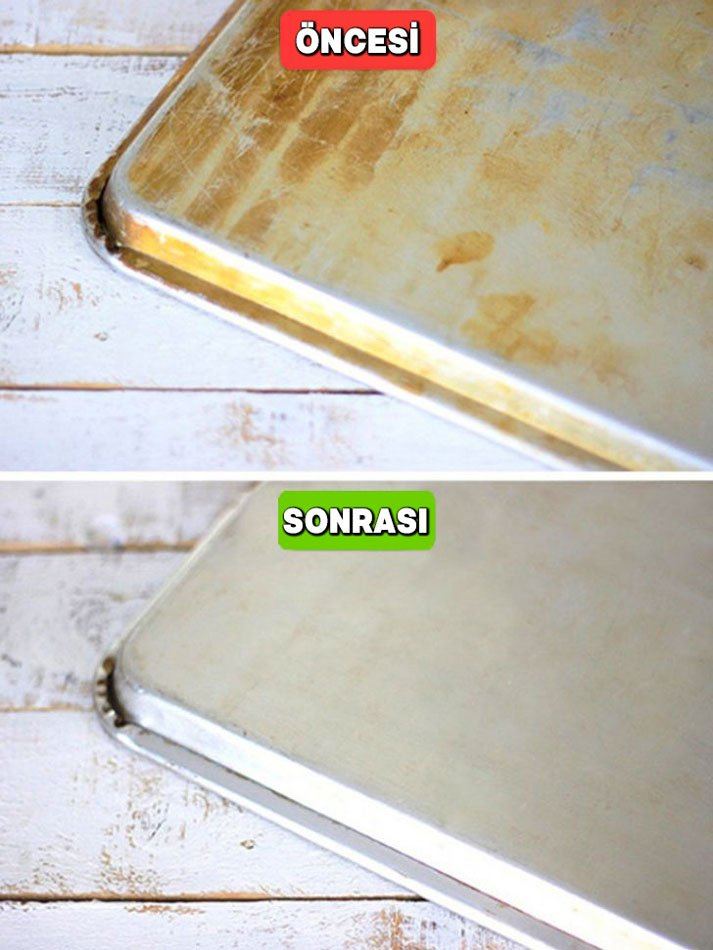 Oksijenli su ve karbonattan yapılmış bir macun uygulayarak yanmış yağlı fırın tepsilerinden kurtulabilirsiniz. Hamuru fırın tepsisine sürün ve 30 dakika bekletin, sonra durulayın.