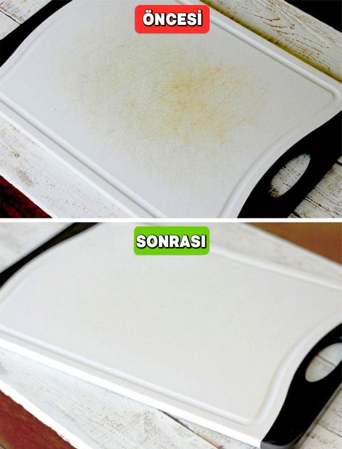 Eskimiş, çizilmiş kesme tahtanızı, limon suyu ve tuz karışımına batırılmış bir süngerle temizleyin. Çizikler yok olacak eskisi gibi yenilenecektir. 🙂