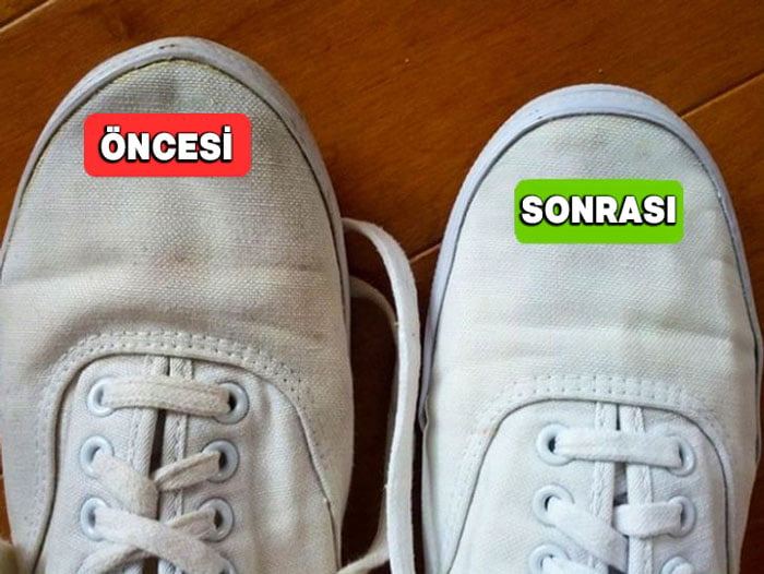 Spor ayakkabılarınızı tekrar beyaza dönüştürebilirsiniz: 1 çay kaşığı bulaşık makinesi temizleme sıvısı; 3 yemek kaşığı oksijenli su; 2 yemek kaşığı karbonatı karıştırın ayakkabınıza güzelce uygulayın biraz bekleyin ve durulayın.