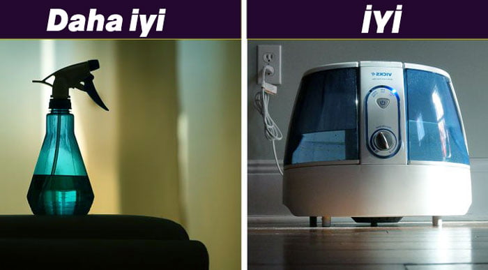 Bir apartman dairesindeki duvar kağıdı, sürekli yüksek nem varsa nemlenebilir ve küflenebilir. Dahası, halı, parke ve laminat da bundan etkilenir. % 55’in üzerindeki nem seviyesinde zemin nemlenir, şişip deforme olabilir ve gıcırdamaya başlayabilir. Ancak çok az insan, nem eksikliğinin vücuda da zararlı olduğunu ve alerji, kuru gözlerden bronşite kadar çeşitli hastalıkların gelişimine katkıda bulunabileceğini bilir. Sağlığınıza dikkat etmek için nemlendirici almanıza gerek yoktur. Nasıl hissettiğinize odaklanın ve havayı daha sık nemlendirin – sıradan bir sprey şişesi bunu yapmanıza yardımcı olabilir.