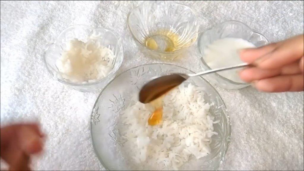 Pirinci yumuşayana kadar haşlayın ve suyunu bir kaseye alın. Pişmiş pirinç, bal ve sütü karıştırın ve bir macun haline getirin. Ardından birkaç kaşık pirinç suyunu üzerine ekleyerek kıvamını krema kıvamına gelecek kadar yumuşatın.