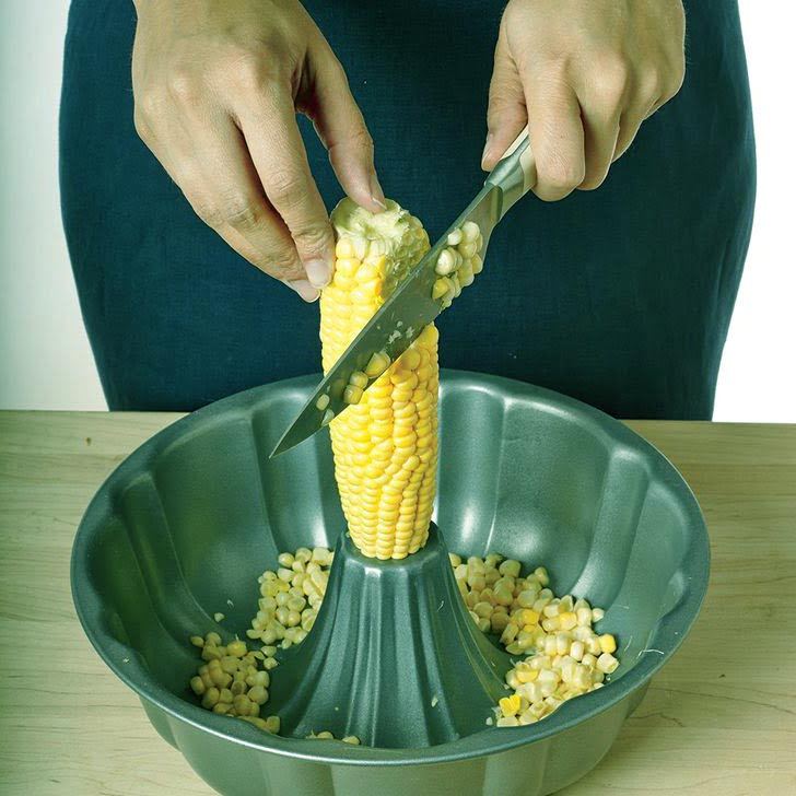 Koçanı bir kek kalıbına dik olarak koyun ve mısır tanelerini keskin bir bıçakla dilimleyin. Sonunda tüm mısır taneleri kasede birikecek ve hiç dağınıklık olmayacak.