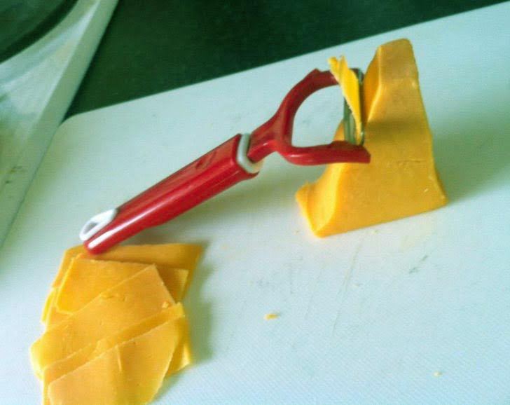 Bunu ben nasıl düşünemedim deyip kendinizi tekmelemeye başlayabileceğiniz bir fikir. Resimde görüldüğü gibi her şey: Çok ince peynir dilimlerini kesmek için sıradan bir patates soyucu kullanın.