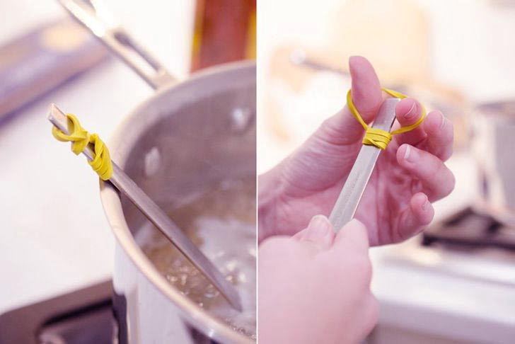 Kaşığınızın tencerenin içine düşmesini önlemek için ucuna lastik bir bant sarmanız yeterlidir .