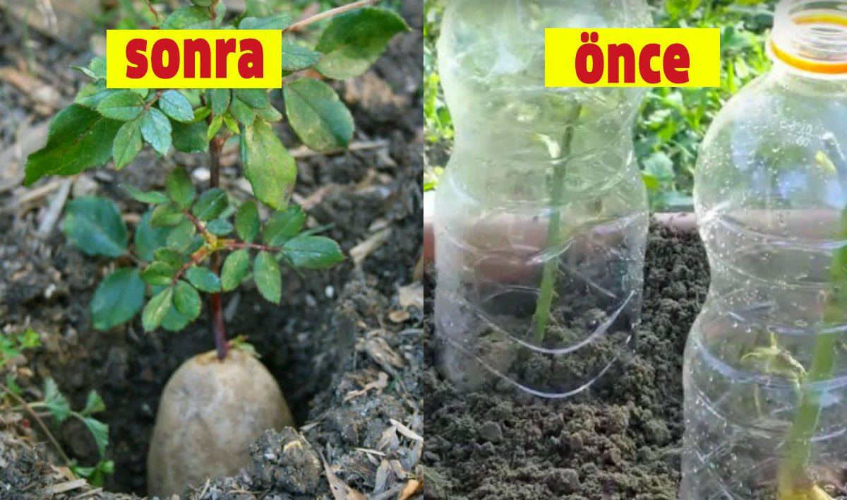 Saksının içine bir miktar toprak dökdükten sonra patatesi gül sapıyla birlikte saksının ortasına yerleştirin.