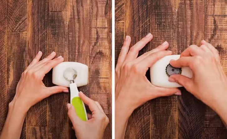 - Sabuna gazoz kapağı büyüklüğünde bir delik açın.