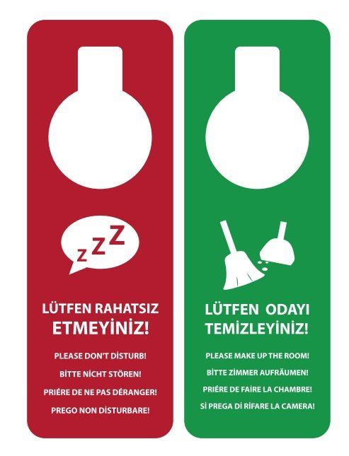 Her otel odasında bir sebepten ötürü “Rahatsız Etmeyin” işareti bulunur. Kapınıza bu kartları asın ve kimsenin mekanınıza beklenmedik bir şekilde girmesine engel olun. Temizlik görevlileri habersiz odanıza pat diye girebilir ve kendinizi garip bir anın ortasında bulabilirsiniz.