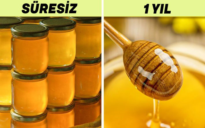 Bal, bazen boğaz ağrısını yatıştırmak için çare bazen de tatlı krizimizi gideren en doğal yiyecektir. Kristalleşebileceğini ve marketten aldığınız balın genellikle son kullanma tarihlerinin olduğunu bilin, ancak doğal bal güneş görmediği taktirde ömrü sonsuza kadardır – Bal, Antik Mısır mezarlarında bile bozulmadan bulunmuştur. Güneş ışığından uzak serin bir kapta saklayın.